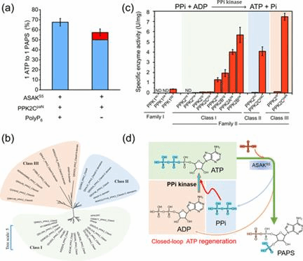首先通过融合来自不同物种的腺苷5′-三磷酸硫酰化酶和腺苷5′-磷酸硫酸激酶,人工创造了一种具有活性的双功能酶来直接将ATP转化为PAPS,显著提高了转化率;为了最大限度地将ATP转化为PAPS,通过筛选消耗低成本聚磷酸作为高能磷酸供体的聚磷酸激酶,设计并构建了依赖于聚磷酸盐的ATP再生系统。研究人员发现焦磷酸PPi可以作为磷酸供体,通过聚磷酸激酶将ADP磷酸化为ATP。在证明了PPi激酶活性在聚磷酸激酶中的广泛分布后,最终建立了一条闭环ATP再生途径,实现了PAPS的高效廉价催化合成。本研究通过构建的低成本高效酶法合成PAPS路线,对于促进磺酸化合物生物合成具有重要的意义。