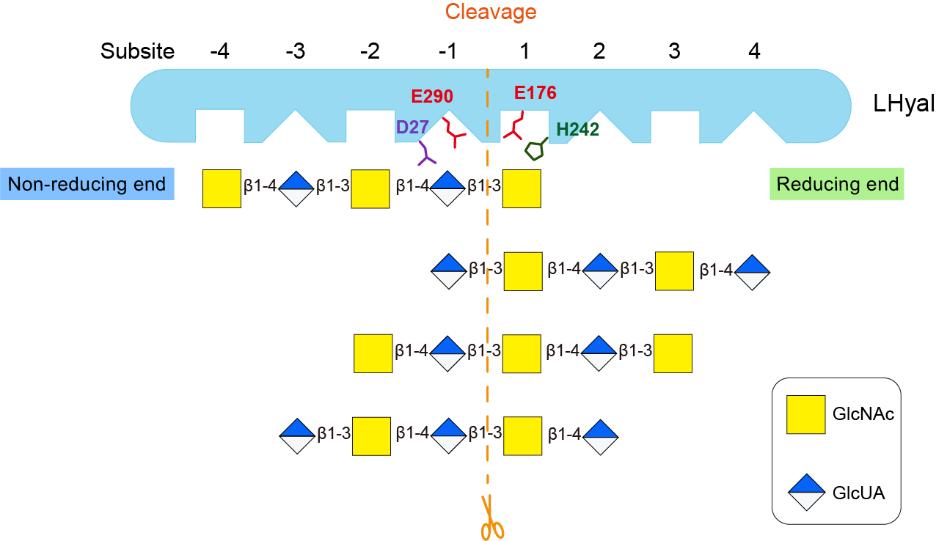 针对该问题,该研究首次解析了特异性水解β-1,3糖苷键的水蛭透明质酸酶(LHyal)的晶体结构,LHyal具有糖苷水解酶79家族(GH79)的经典结构特征,由一个(β/α)8-桶状催化结构域和一个β-sandwich结构域组成。通过与其他GH79家族蛋白进行结构比对分析,LHyal在结合裂缝一侧具有一个较长的loop环,而该区域影响糖苷水解酶切割底物的作用模式。使用分子对接并进行定点突变实验,确定了位于活性位点裂缝中的关键氨基酸残基。此外,上述loop环中的两个碱性氨基酸R102和K103通过与带负电的透明质酸发生静电相互作用,对于底物结合至关重要。最后,制备了一系列不同长度的奇数及偶数透明质酸寡糖,并用于探究LHyal的识别和裂解模式。结果表明LHyal的天然最小底物是六糖,且糖链在结合裂缝内占据五个结合亚位点是切割所必需的。该研究为进一步理解透明质酸的降解机制及GH79家族蛋白进化的关系提供了新的思路。