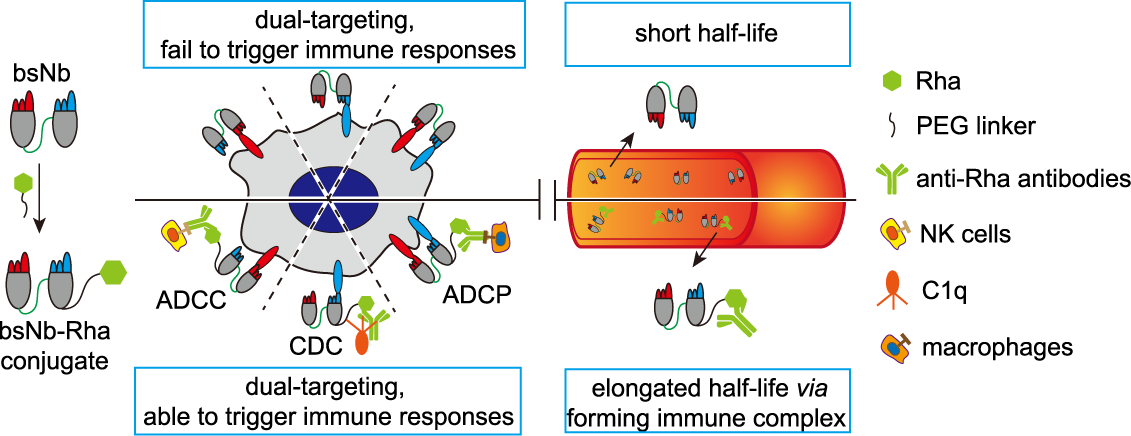 双特异性抗体(bsAbs)是下一代抗体类生物药。其中,Non-IgG-like双特异性抗体是抗体片段组成的新型bsAbs,具有结构简单、易于生产和肿瘤组织渗透性高等特点。然而Non-IgG-like双特异性抗体不含有全长抗体的Fc端,因此无法发挥Fc介导的免疫效应功能,如抗体依赖细胞介导的细胞毒作用(ADCC)、抗体依赖细胞介导的细胞吞噬作用(ADCP)和补体依赖的细胞毒作用(CDC);另外,该类新型双特异性抗体由于分子量小,在体内的半衰期短,需要频繁给药才能达到治疗效果。