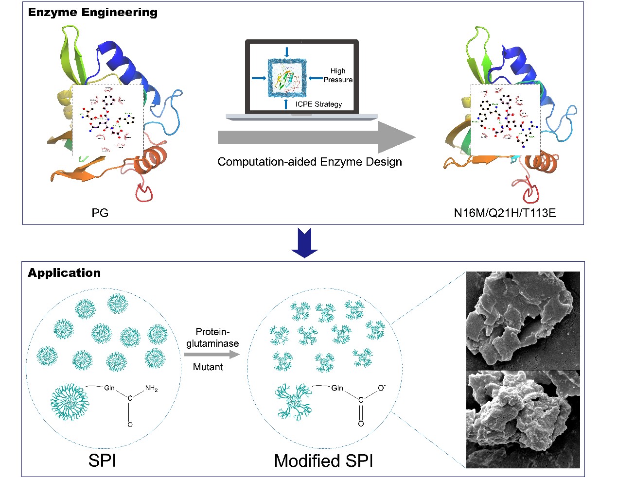 植物蛋白来源广泛、价格低廉是食品行业使用蛋白质的首选。然而,许多植物蛋白富含谷氨酰胺和天冬酰胺,通过疏水或氢键相互作用导致蛋白质分子的聚集和沉淀,使溶解度降低,从而影响植物蛋白的起泡性、乳化性以及凝胶特性等,限制其在食品领域的应用。蛋白质谷氨酰胺酶特异性地作用于蛋白的谷氨酰胺残基,产生谷氨酸并释放氨,而不影响游离天冬酰胺和谷氨酰胺,已广泛应用于植物蛋白的改性和加工。然而,天然的蛋白质谷氨酰胺酶因其低稳定性和活性难以满足工业需求,因此,提高蛋白质谷氨酰胺酶的稳定性和活性是亟待解决的问题。对蛋白质谷氨酰胺酶改造主要面临两个挑战:(1)缺乏高效的定向改造技术提高其稳定性和活性;(2)蛋白质谷氨酰胺酶在复杂的食品加工环境(如高剪切和高压)下的适应性机制不明确。