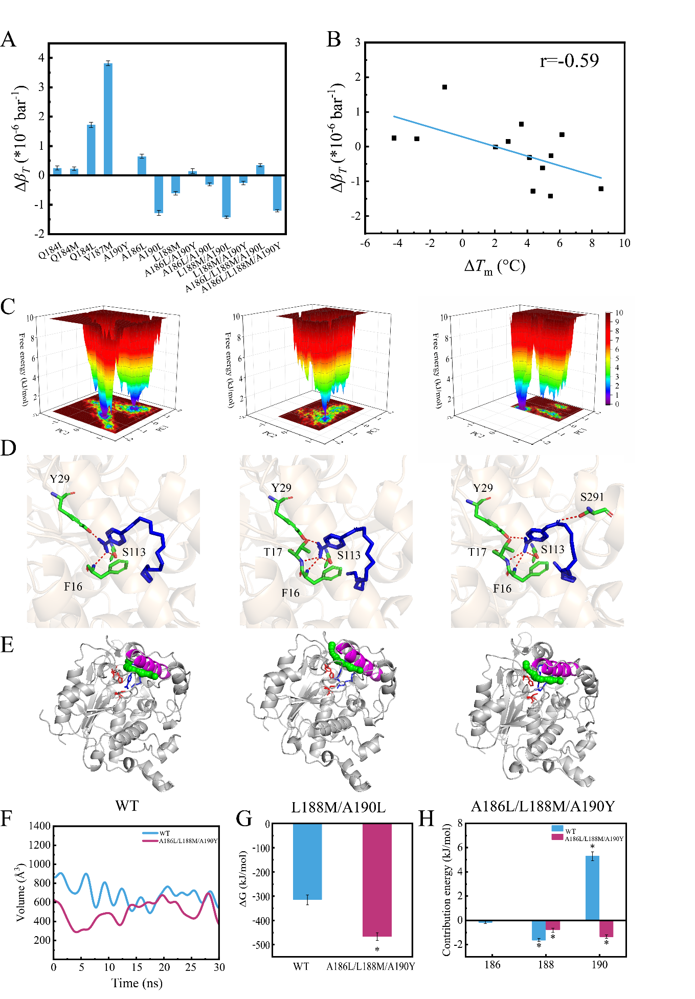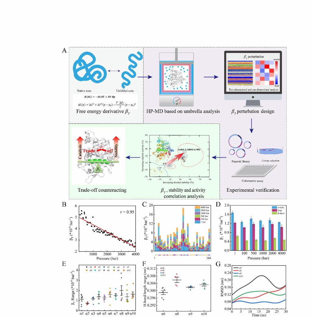 作者以T1脂肪酶作为研究对象,通过等温压缩系数微扰工程策略构建一系列突变体,经系统地分析发现突变体的稳定性与活性呈现强相关性(r=0.93)。最优突变体A186L/L188M/A190Y的Tm值高达78.7°C,比酶活为474.04 U/mg,DMSO耐受性较野生型提高73.33%。由等温压缩系数介导的弹性激活机制解析了稳定性和活性之间的权衡。等温压缩系数微扰工程策略加深了对稳定性-活性权衡的理解,促进了其在酶工程中的应用。