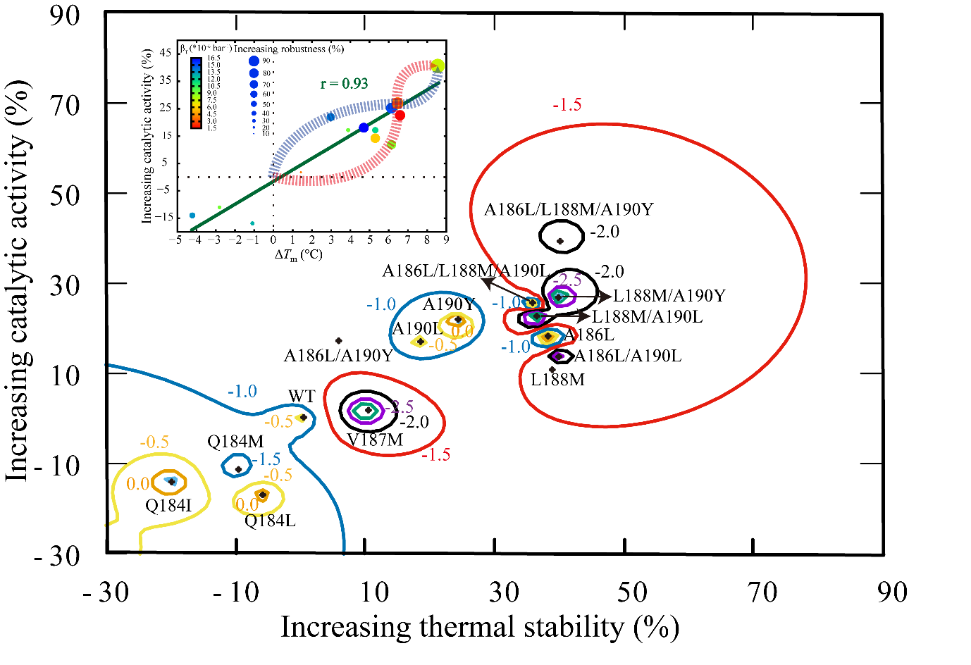 Figure 5.Contour plot ofΔβTand network representation of the T1 lipase fitness landscape.
