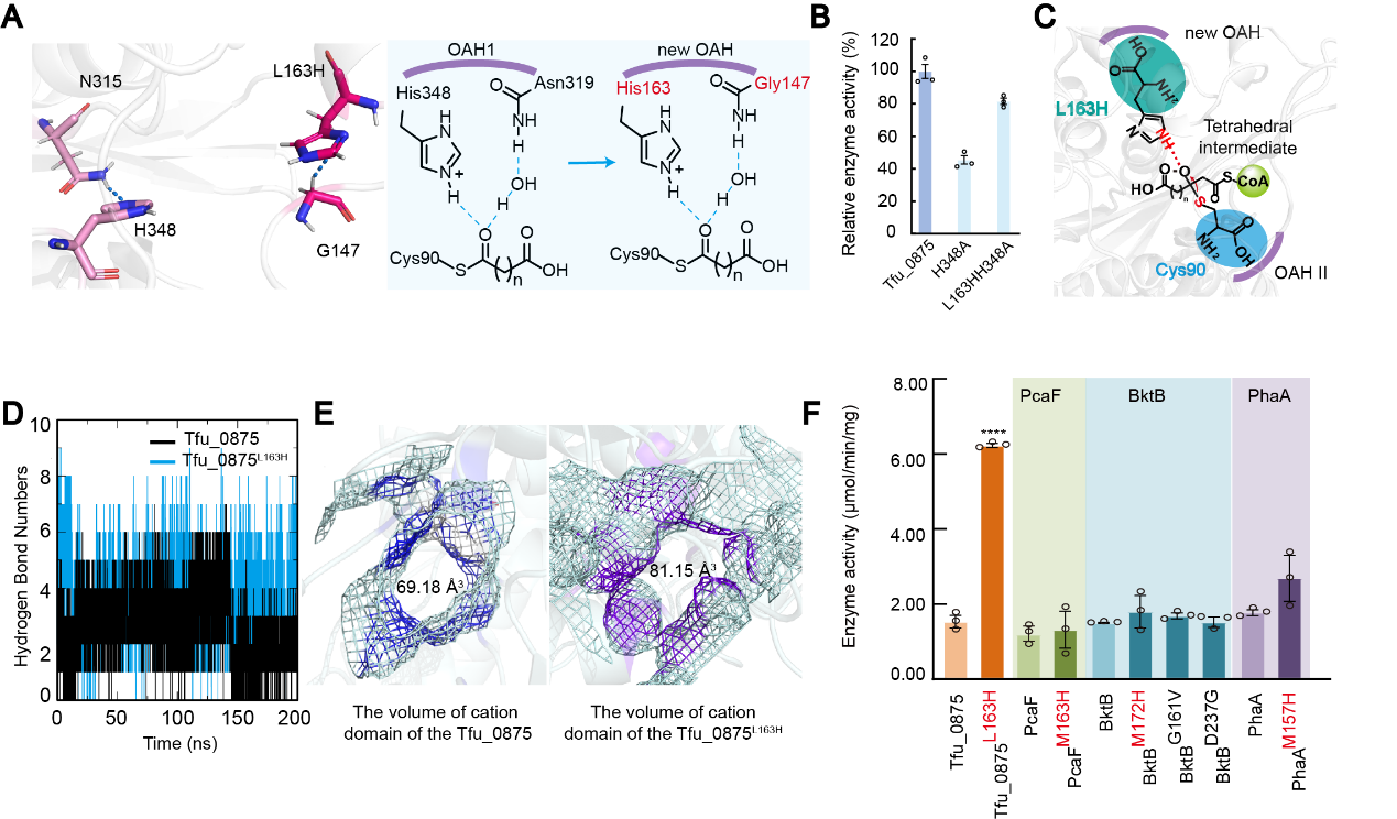 经筛选后发现Tfu_0875阳离子域的突变体L163H酶活提高最显著,比Tfu_0875提高了313%。L163H的咪唑基团比活性中心His348的咪唑基团更接近底物乙酰辅酶A的Cα原子,且Tfu_0875L163H的G147可以与L163H形成氢键,这与Tfu_0875中的活性中心H348和N315 (OAH1)相同。同时测量Tfu_0875H348A和Tfu_0875L163H/H348A的相对酶活性,结果表明Tfu_0875L163H/H348A的相对酶活性比Tfu_0875H348A高1.79倍,因此认为突变体L163H可以发挥与His348相同的作用,作为氢键供体帮助锚定底物。经过分子动力学模拟发现,Tfu_0875L163H产生的氢键数量明显高于Tfu_0875,说明Tfu_0875L163H与底物乙酰辅酶A之间存在更强的相互作用,可以更快锚定底物乙酰辅酶A,间接缩短反应时间。此外,当L163变为H163时,阳离子域的体积从69.18 Å3增大到81.15 Å3。