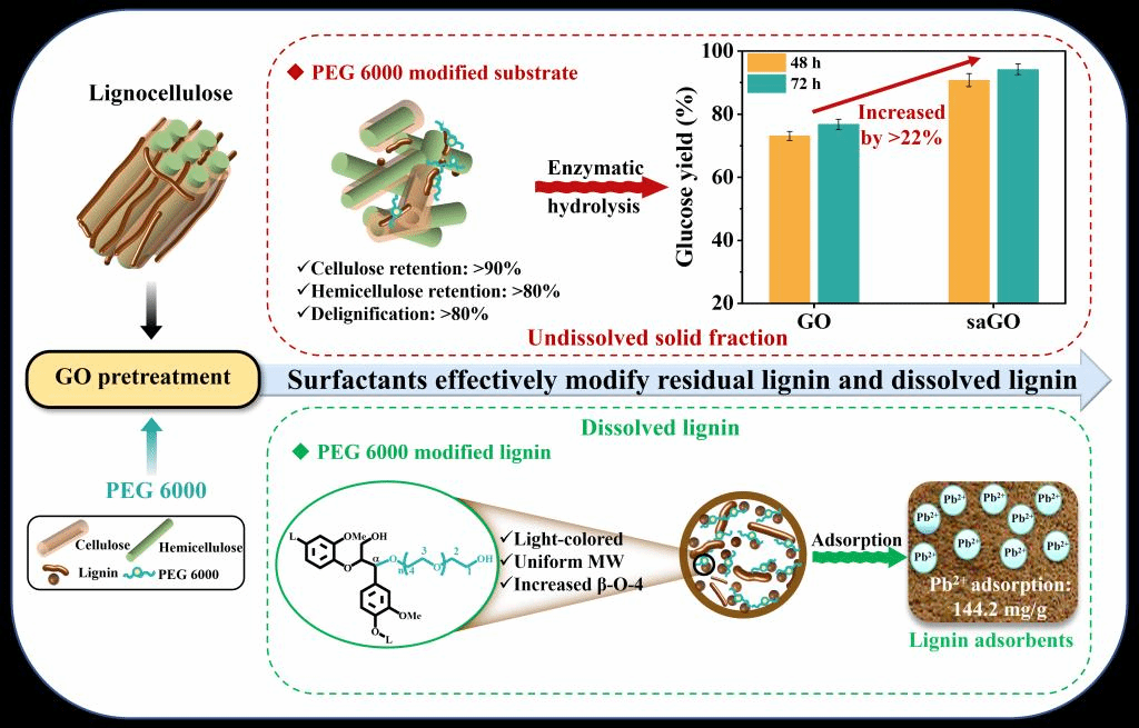 针对以上问题,孙付保教授团队发现非离子表面活性剂(聚乙二醇、吐温等)添加于甘油有机溶剂预处理过程可增强预处理后底物的可酶解性,通过现代分析技术手段初步阐明非离子表面活性剂促进底物可酶解性的机理:非离子表面活性剂在预处理过程中接枝性修饰固体底物中残留木质素结构,使其保留更多β-O-4连接键和较少酚羟基(PhOH),从而削弱木质素与纤维素酶的非特异性结合;同时,非离子表面活性剂接枝性修饰溶解木质素的结构,使其成为高反应活性木质素。