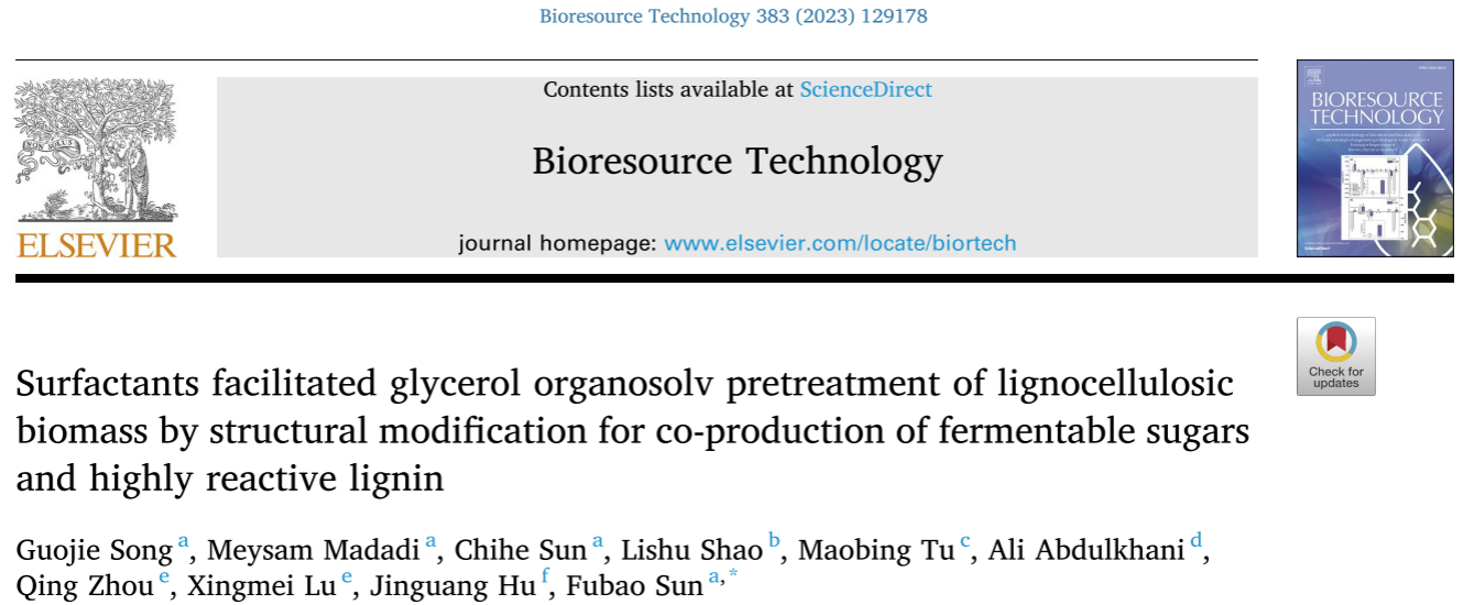 孙付保教授团队在研究先进预处理方法促进纤维质底物酶解制糖方面取得重要进展,研究成果“Surfactants facilitated glycerol organosolv pretreatment of lignocellulosic biomass by structural modification for co-production of fermentable sugars and highly reactive lignin”正式发表于Bioresource Technology (一区, Top, IF=11.9)。