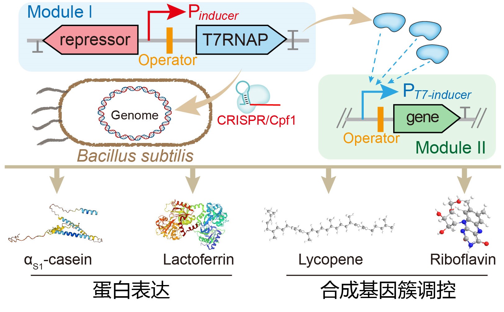 枯草芽孢杆菌(Bacillus subtilis)是革兰氏阳性模式微生物,具有遗传背景清晰、无明显密码子偏好性等优势,在工业生产中具有广泛应用。由于具有高特异性和超强的表达强度,基于T7 RNA聚合酶(T7RNAP)和T7启动子(PT7)的表达系统被广泛用于大肠杆菌中重组蛋白的生产,尽管目前已有研究尝试将T7表达系统适配于B. subtilis,但它们都具有一定的局限性,如使用特定的底盘菌株和过时的基因组编辑方法。