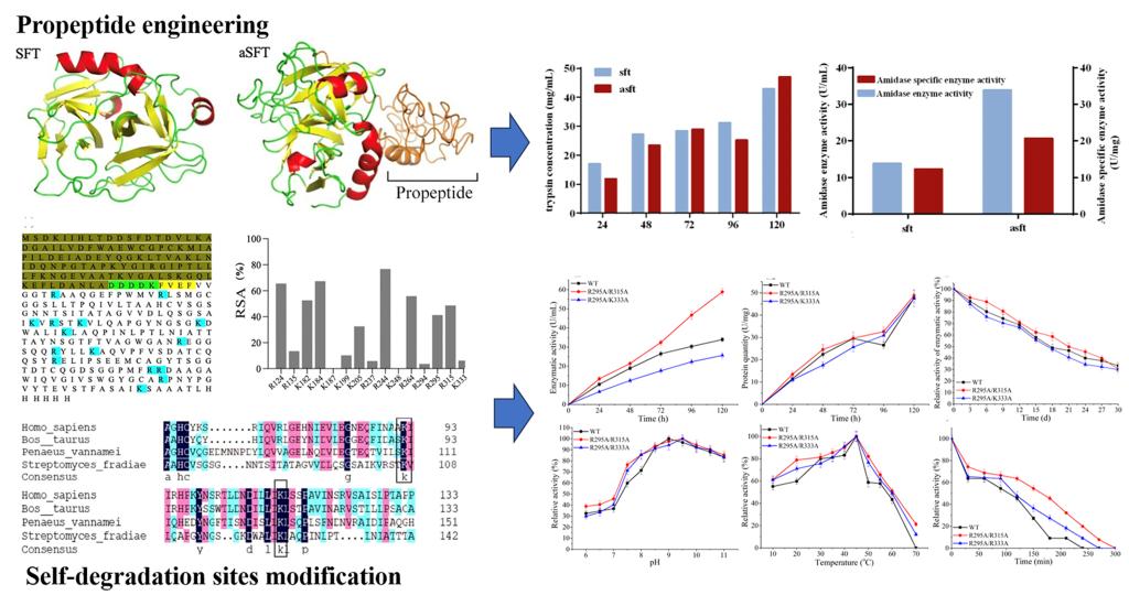 胰蛋白酶是(EC 3.4.21.4)是一种丝氨酸蛋白,能专一性切割肽链中精氨酸或赖氨酸残基,被广泛应用于皮革软化、食品加工、临床诊断和生化检测等领域。微生物产胰蛋白酶具有方便快捷、成本低的特点,但是其存在表达量低、易自降解等问题。因此,需要通过基因工程和酶工程方法提升胰蛋白酶的表达量。