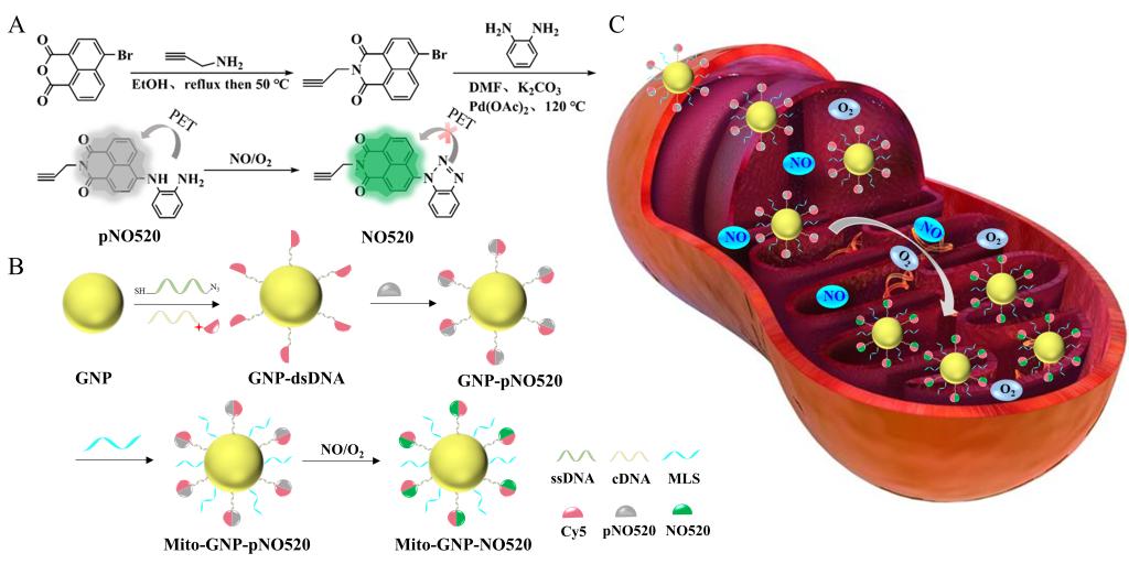 周楠迪教授团队开发了一种基于金属荧光增强效应(MEF)的比例荧光生物传感器Mito-GNP-pNO520,用于活细胞线粒体NO的检测和实时成像。首先设计并合成了一个荧光峰位于520 nm处的NO响应探针(pNO520)。随后,定向制备了与pNO520光谱重叠明显的纳米金球(GNP)。通过引入不同碱基对数目(bp)的双链DNA (dsDNA)来调整GNP与pNO520之间的距离。最后,在GNP表面修饰线粒体靶向肽(MLS),使其特异性靶向线粒体。在没有NO的情况下,由于邻苯二胺和萘酰亚胺之间的光诱导电子转移效应(PET), Mito-GNPpNO520显示出极弱的荧光。然而,NO在O2存在下与Mito-GNP-pNO520反应形成苯并三唑衍生物(NO520),通过抑制PET效应表现出荧光开启。无论是否存在NO, Mito-GNP-pNO520中Cy5的荧光强度保持不变。因此,可以根据NO520与Cy5的荧光强度比对NO进行定量检测和荧光成像。该传感器在1 ~ 90 nM的浓度区间内对NO浓度表现出良好的线性响应,检测限低至0.25 nM。本研究在线粒体NO的检测和实时成像方面具有广阔的前景,且具有较低的检测限以及较高的稳定性和特异性,为探索亚细胞水平NO相关的生理病理信息提供了有力的工具。