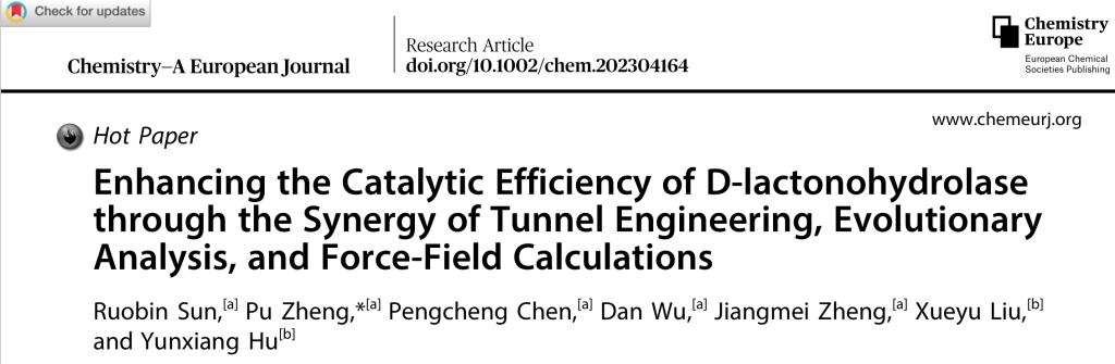郑璞教授团队在组合计算策略提高D-泛解酸内酯水解酶催化效率方面取得重要进展,并发表研究成果“Enhancing the Catalytic Efficiency of D-lactonohydrolase through the Synergy of Tunnel Engineering, EvolutionaryAnalysis, and Force-Field Calculations”, (Hot Paper).(//doi.org/10.1002/chem.202304164)