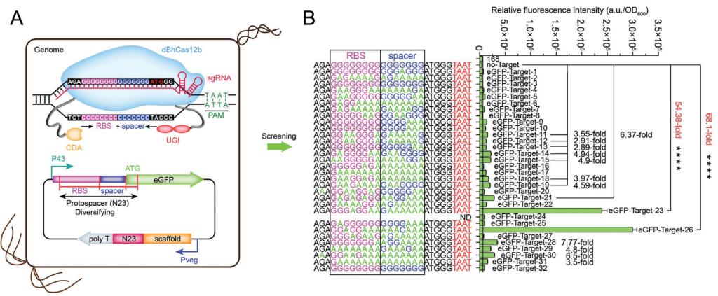 将CBE系统用于枯草芽孢杆菌目标基因RBS+Spacer的大窗口(15 nt)共进化,构建RS组合突变文库,筛选得到eGFP表达强度提升68.1倍的最佳RS组合突变。另外,在E. coli中也测试了本CBE系统的宿主适用性,结果发现,该CBE在E. coli也同样适用,能够在PAM两端(以PAM为0点)同时诱导C到T的突变(C-15~C26),编辑窗口高达41 nt,甚至超出了protospacer(23 nt)。全基因组测序证明,dBhCas12b-CBE并没有发生可检测的脱靶效应,证明了该系统是一个高精度的基因组编辑器。