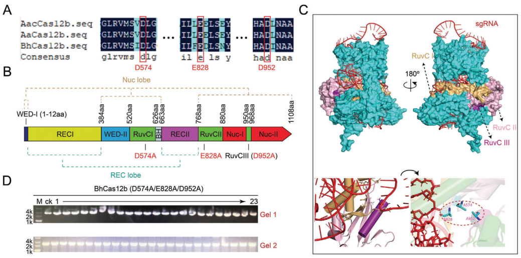 针对上述关键科学问题,本研究提出使用分子量较小的Cas12b构建BE系统,其与脱氨酶融合可以尽量减弱Cas蛋白的大空间位阻对于脱氨酶编辑窗口的限制效应。首先在重要模式工业菌株枯草芽孢杆菌中构建了CRISPR/BhCas12b系统,结合多序列比对及BhCas12b/sgRNA复合体结构预测模型,确定BhCas12b上负责DNA切割的三个关键残基(D574,D828和D952),并通过失活突变构建了完全丧失DNA切割能力、但保留与sgRNA高效结合及定位靶标基因能力的dBhCas12b。