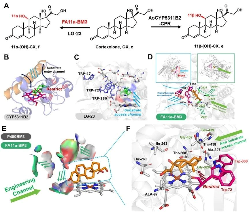 食品合成生物学与生物制造团队研究人员基于计算模拟指导改造了P450BM3并用于黄体酮合成皮质酮再合成氢化可的松的两步合成途径中。第一步合成:以野生型P450BM3(Bacillus megaterium来源)出发,逐步通过B-Factor指导的底物通道改造、重塑heme中心口袋和自由能计算指导的heme中心口袋柔性化的三代精细化酶工程,最终获得了VD16-BM3、VD17-BM3、VD21-BM3和VD1721-BM3可以分别高效区域选择性羟化黄体酮的C16β、C17α、C21和C17α/21,值得注意的是VD1721-BM3可以将黄体酮合成皮质酮的步骤简化为一步单酶反应。第二步合成:需要获得高效催化元件羟基化修饰皮质酮的C-11位,首先分别验证了文献报道的CYP5311B2和LG23,其中CYP5311B2可以羟化修饰皮质酮的C-11β,其转化率和区域选择性分别为93%和91%,可以用于后续氢化可的松全细胞合成体系构建。CYP5311B2和LG23催化进程研究发现底物通道是影响P450羟化修饰甾体不同碳位的关键,因此基于底物通道切换策略,理性改造得到了FA11a-BM3可高效催化皮质酮合成11α-氢化可的松,转化率和区域选择性分别为85%和90%。分子动力学模拟揭示了heme中心口袋排斥底物残基的柔性化有助于目标羟化碳位稳定暴露于FE=O上方。最终,将开发的P450突变体用于构建高效的大肠杆菌全细胞催化体系,实现了从1 g/L黄体酮一锅生产11α/β-氢化可的松,摩尔转化率为81%和84%。本研究为简化甾体药物的生物合成步骤和生物催化剂提供了可行的策略。