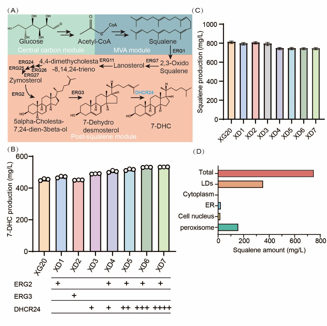 图1 酿酒酵母7-DHC合成路径的增强及前体积累分析