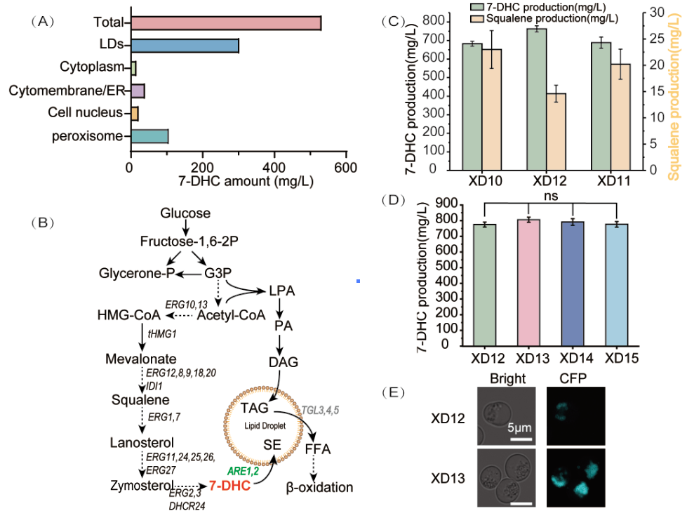 针对上述问题,该研究以前期一株可以合成7-DHC的酿酒酵母菌株为研究对象,首先,通过差速离心和可视化等技术,揭示了7-DHC的关键前体角鲨烯主要被封存在脂滴中(图1),而将角鲨烯转化为7-DHC的后角鲨烯途径的相关酶主要位于内质网中(图2),推测限制7-DHC高效合成的关键因素是脂滴对角鲨烯的封存作用;为此,本研究在脂滴中重构了后角鲨烯途径,获取的重组菌株胞内角鲨烯的含量降低了97%,摇瓶水平7-DHC的产量提升至684.1 mg/L(图3)。后续研究发现,后角鲨烯途径在脂滴中的重构会促使7-DHC在脂滴中贮存,这种贮存可以有效降低胞质7-DHC累积对细胞造成的毒害。为此,本研究一方面通过敲除TGL3减弱三酰基甘油降解,以增大脂滴中7-DHC的可储存空间,另一方面过表达ARE2加强酯化作用,以引导7-DHC更高效地储存于脂滴中,获得的重组菌株7-DHC的产量达到792.9 mg/L(图4);最后,结合辅因子平衡优化,7-DHC在摇瓶水平的产量达到867.6 mg/L,3-L发酵罐中的产量达到5.1 g/L,这是迄今为止报道的最高产量(图5)。相关研究成果为构建可高效合成固醇类化合物的细胞工厂提供了重要参考。