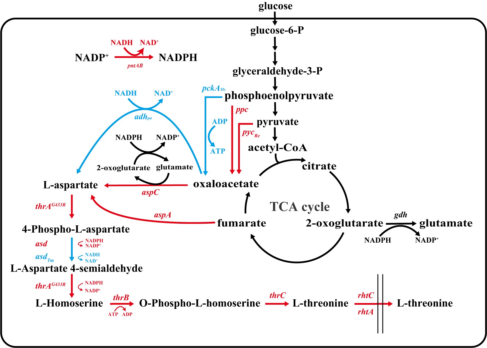 饶志明教授团队首先对苏氨酸合成途径限制步骤进行了验证,发现过表达NADH偏好性的天冬氨酸半醛脱氢酶(Asd)以及天冬氨酸脱氢酶(Adh)来协同利用辅因子NADH和NADPH合成L-苏氨酸,以及引入异源磷酸烯醇丙酮酸羧激酶(Pck)增强ATP的供给可以促进L-苏氨酸的生产。然后,引入活性降低的柠檬酸合成酶(GltA F383M)突变体,在保证细胞正常生长的状态下合理降低进入TCA循环的碳通量(降低CO2的排放),使更多的碳源通过磷酸烯醇式丙酮酸和丙酮酸(无碳源损失途径)生成草酰乙酸进而合成L-苏氨酸。随后,通过转录组学分析,比较大肠杆菌在有无外源添加L-苏氨酸时基因表达水平的变化,从中筛选并确定了应激响应全局调控因子UspA的过表达可以促进L-苏氨酸的产生。最后,通过引入抗逆性调节转录调控因子IrrE提高宿主的鲁棒性以及引入全局转录调控因子CRP R83F, G142P突变体解除高葡萄糖浓度下对Ptrc启动子转录水平的抑制,使得菌株的葡萄糖利用速率和L-苏氨酸产量进一步提高。在5L发酵罐中进行补料分批发酵验证THRH16菌株的L-苏氨酸生产性能,其在45h积累了170.3 g/L L-苏氨酸,糖酸转化率为0.625 g/g,生产力为3.78 g/L/h,是目前报道的最高L-苏氨酸生产指标,并且发酵过程无需添加抗生素以及诱导剂,本研究策略为提高其他化学品的生产提供了合理的指导。