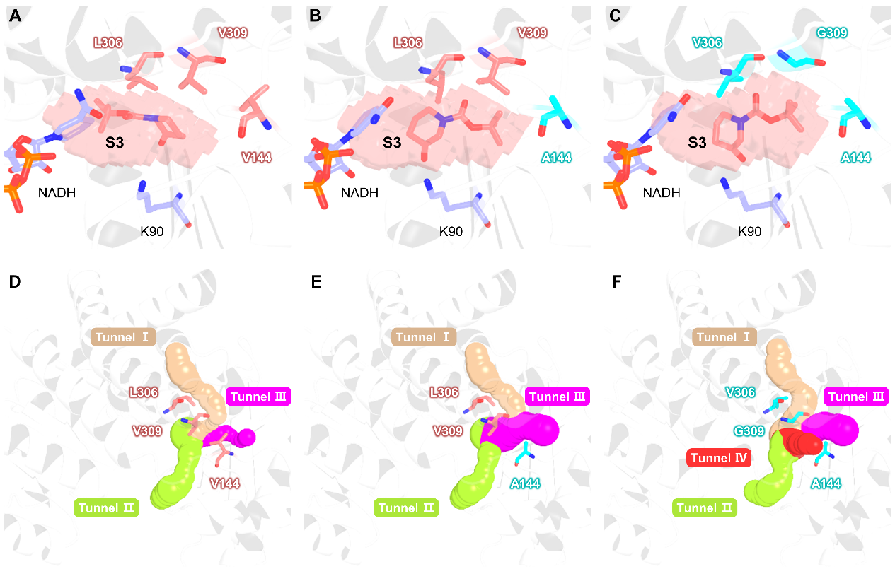 穆晓清/聂尧组ACS Catalysis|重塑亮氨酸脱氢酶底物结合口袋以双向催化结构多样性底物)、ACS Catalysis. 2024; 14: 2685-2695-封面论文、Chemical Engineering Journal. 2024; 490: 141735),选择N-Boc-3-哌啶酮作为本研究中胺脱氢酶催化的氮杂环酮模型底物,通过基于逆行底物设计策略的起始底物筛选,对模型底物进行结构拆解,选择小尺寸的N-Boc-3-乙酸甲酯作为底物接受度改造的起始底物,并以起始底物的催化活性为筛选指标,从实验室建立的小型胺脱氢酶文库中筛选出源于栗褐芽孢杆菌(Bacillus badius)的苯丙氨酸胺脱氢酶(F-BbAmDH)作为目标氮杂环酮底物接受度改造的出发酶。随后,进一步通过基于结构指导的底物结合口袋空间位阻突变对F-BbAmDH进行底物接受度进化,获得的单点突变体V144A成功产生了模型底物N-Boc-3-哌啶酮的底物特异性,额外的两轮迭代位点组合突变构建的三点突变体V144A/V309G/L306V对模型底物N-Boc-3-哌啶酮的催化活性较单点突变体V144A提高了143.4倍(图2)。