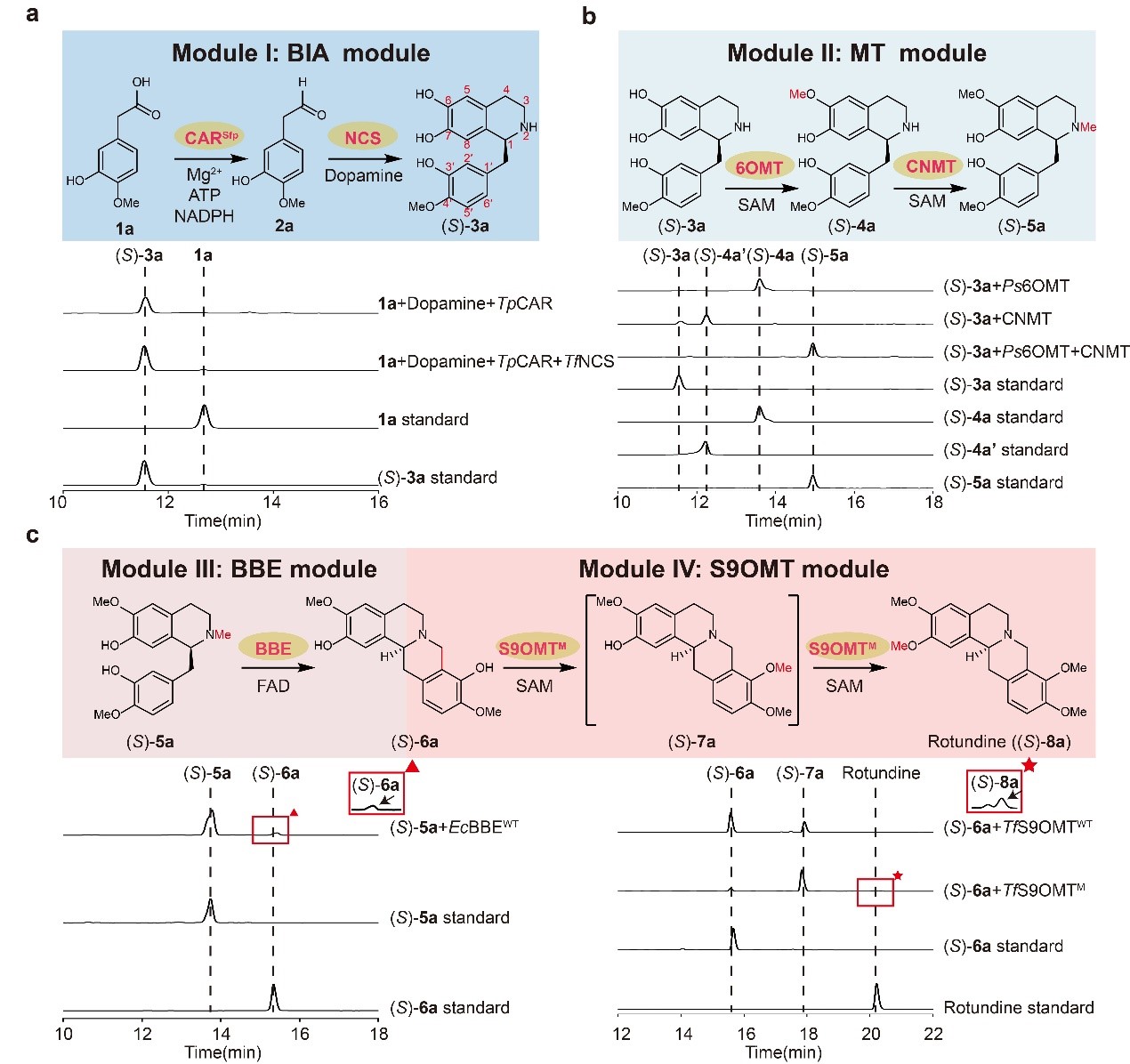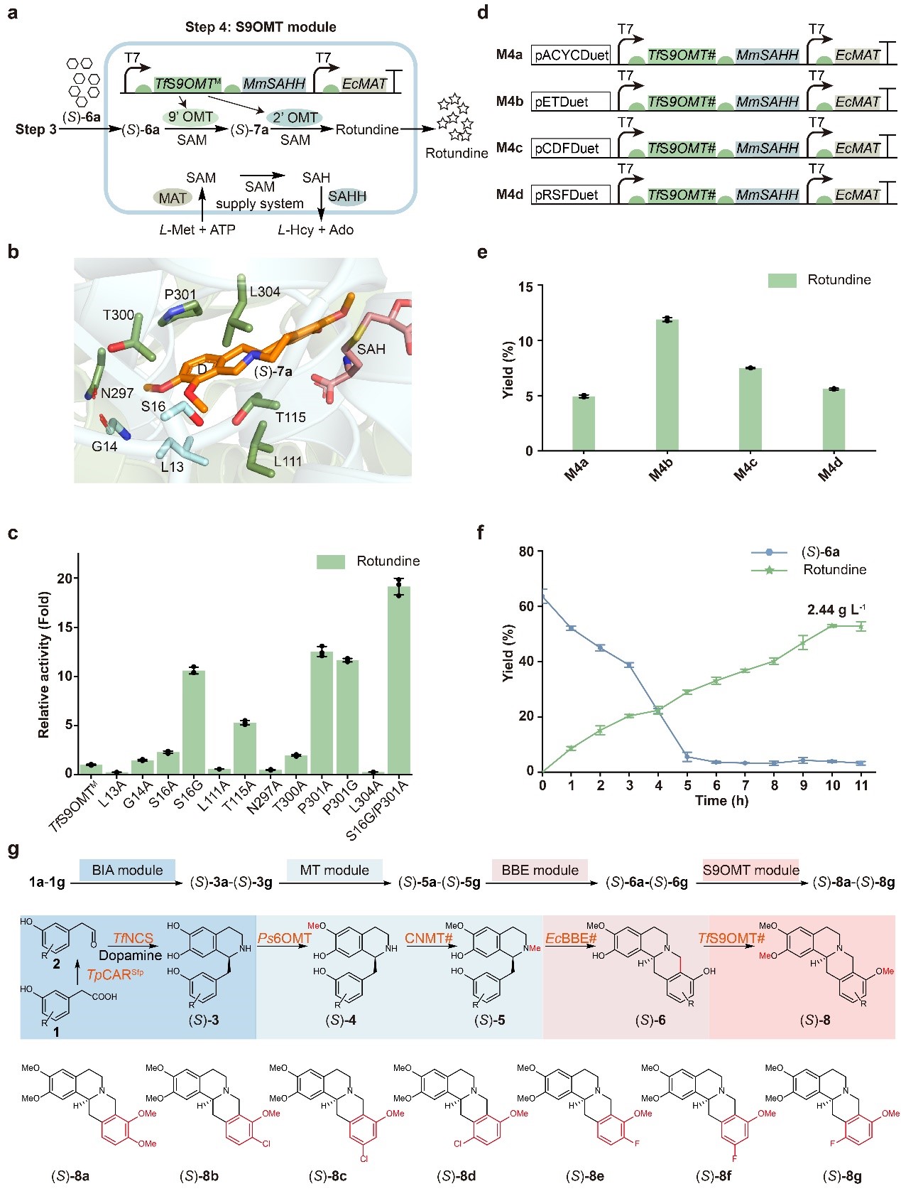 随后,作者以3-羟基-4-甲氧基苯乙酸为模式底物测试多酶级联反应的可行性。作者筛选了具有高催化活性的CAR和NCS,实现(S)-3a的高效合成;其次,筛选了5种不同来源的6OMT并与CNMT共同催化,实现了中间体(S)-5a的生产;接着,筛选了有结构报道的BBE和S9OMT,尽管BBE模块和S9OMT模块的催化效率不高,但结构的报道能有效指导定向进化,且在体外实现了目标产物罗通定的合成,证明了该多酶级联反应的可行性(图2)。