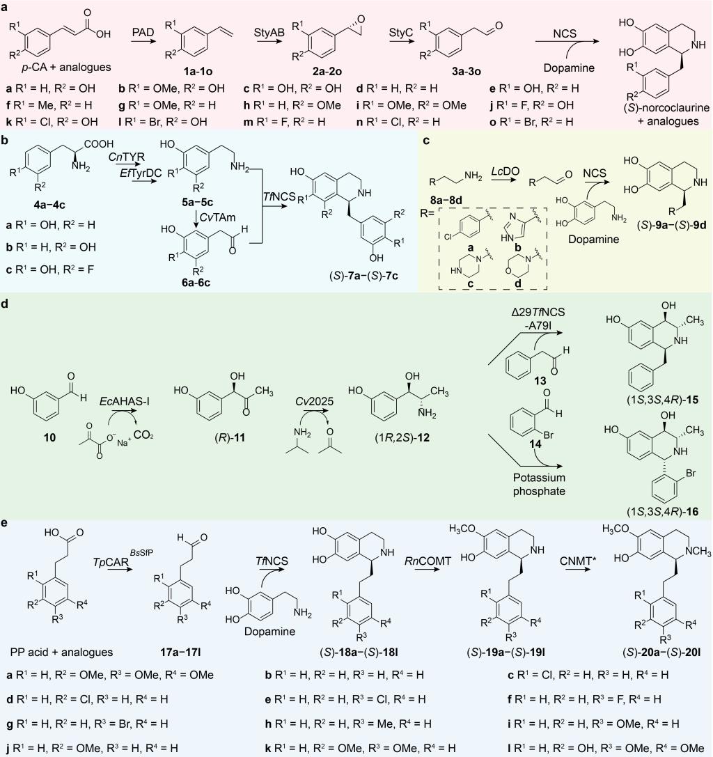 近年来,随着基因组学、转录组学和代谢组学技术的进步,研究人员解析了多个THIAs的天然合成途径,特别是秋水仙碱、加兰他敏和原吐根碱(图1),为此类化合物的微生物异源合成提供了坚实的基础。通过结合蛋白质工程、辅因子工程和全局优化工程等手段,成功在大肠杆菌和酿酒酵母中实现了多种THIAs的高效合成,如吗啡、诺司卡品和血根碱等。通过构建人工多酶级联反应,简化了天然产物的合成步骤,有效地提高了终产物产量(图2)。此外,化学酶级联反应也为THIAs的合成提供了新的思路,结合化学合成和酶催化的优势,实现了复杂分子的高效合成(图3)。尽管目前仍面临THIAs在微生物异源合成产量低等挑战,但通过新酶挖掘、辅因子工程、模块化调控和设计人工多酶级联反应等策略,未来有望实现THIAs的工业化生产。这项研究为THIAs的高效生物合成提供了新的思路,预示着未来通过微生物工厂大规模生产这些高价值化合物的可能性。