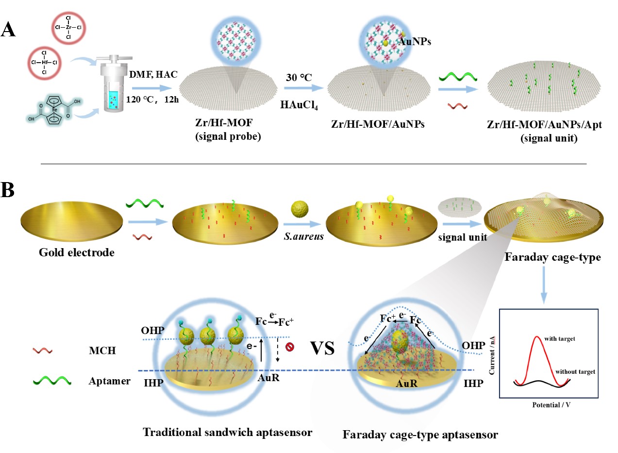 图1 Zr/Hf-MOF纳米膜的制备过程示意图(A)和基于法拉第笼的金黄色葡萄球菌检测配体传感器的制备及其机理(B)