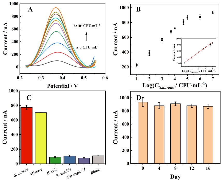 图2 (A) 10 CFU·mL−1 ~ 1 × 107 CFU·mL−1不同浓度下金黄色葡萄球菌法拉第笼型配体传感器的DPV曲线,(B) DPV峰值电流随金黄色葡萄球菌浓度的对数变化。附图为DPV强度与金黄色葡萄球菌浓度对数的线性关系。(C)对105 CFU·mL−1金黄色葡萄球菌和105 CFU·mL−1常见干扰菌的选择性和抗干扰性评价;(D)对105 CFU·mL−1金黄色葡萄球菌的稳定性评价