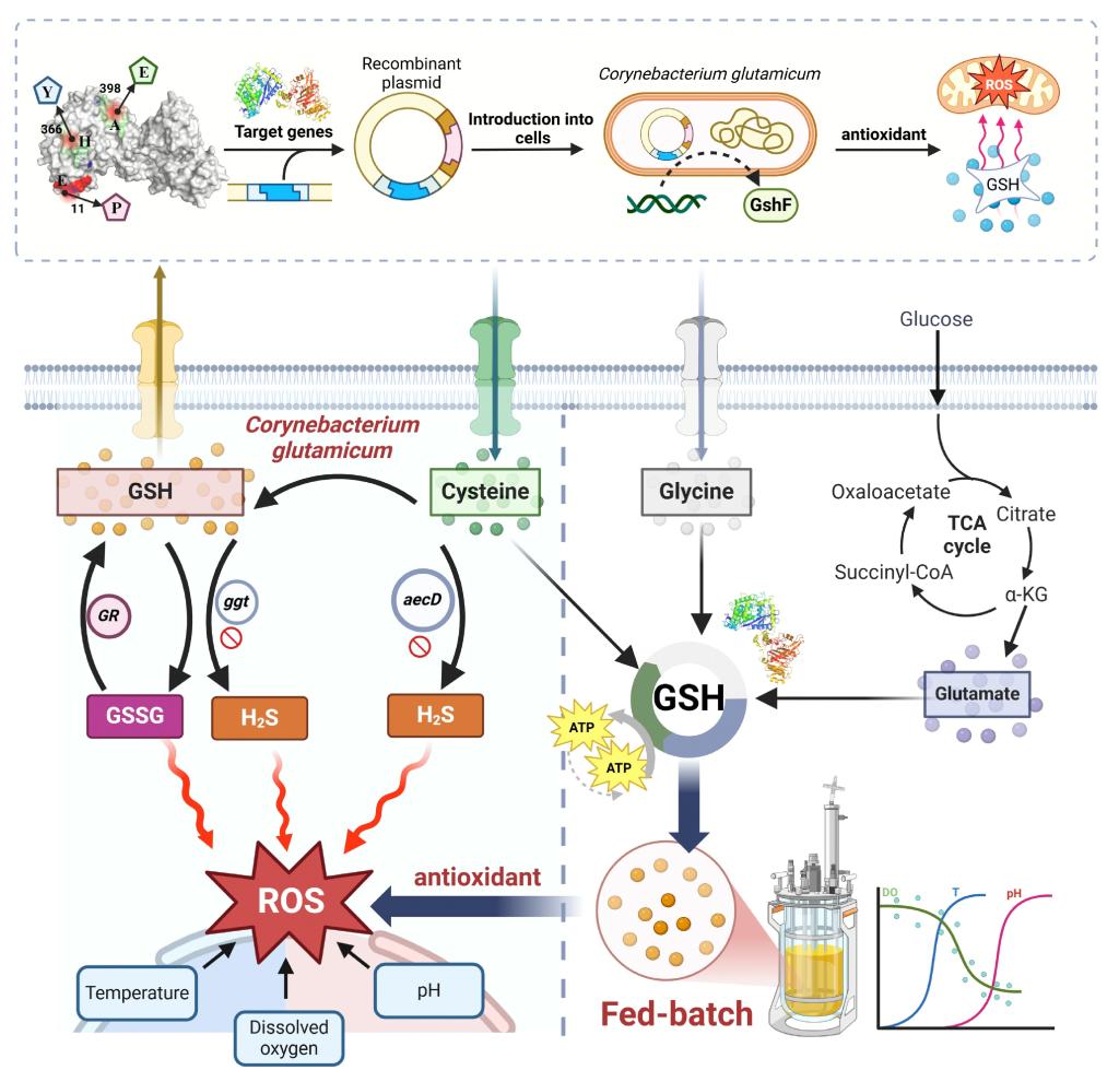 谷氨酸棒杆菌是氨基酸发酵行业的核心菌株,其底物谱广泛并具有良好的底/产物耐受性,已被设计用于各种碳氮源生产氨基酸、生物基材料单体和营养化学品等。谷氨酸棒杆菌在高溶氧发酵条件下生产氨基酸和有机酸时易产生大量ROS,显著影响其细胞性能和目标产物的代谢合成效率。谷胱甘肽(GSH)是一种由L-谷氨酸、L-甘氨酸和L-半胱氨酸组成的三肽,是细胞中含量最多的生物硫醇,作为一种典型的内源性抗氧化剂,参与细胞内酸、毒素、氧化物等物质的解毒,从而维持生命系统的氧化还原稳态。