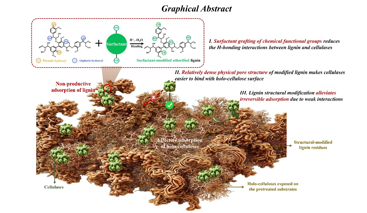 生物资源与生物炼制研究团队在表面活性剂修饰型预处理增效纤维质酶解作用方面取得重要进展,研究成果“Role of in-situ surfactant modification of lignin structure and surface properties during glycerol pretreatment in modulating cellulase-lignin binding affinities”正式发表于Journal of Colloid And Interface Science(一区, Top, IF 9.4)。