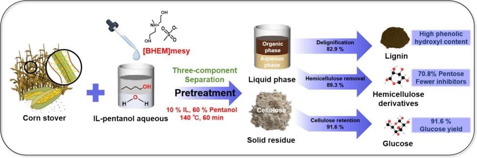 离子液体(ILs)因其出色的溶解性能,在木质纤维素预处理中表现出极高的效率。然而,传统离子液体预处理的单相特性不仅导致组分混合,使分离和利用过程变得复杂,还因成本高昂而限制了其大规模应用。为应对这些挑战,本研究开发了一种双相预处理系统,将质子型离子液体[BHEM]mesy与水-戊醇混合,旨在温和条件下高效分离玉米秸秆。系统研究了不同条件对玉米秸秆成分的影响。在最佳预处理条件(10%IL,60%戊醇,140℃,60分钟)下,固体残渣中纤维素含量达到91.6%,半纤维素和木质素的去除率分别为89.3%和82.9%。与单独使用IL或戊醇预处理的残渣相比,预处理后的残渣在酶解效果上显著提升。在双相体系中,70.8%的可利用木糖溶解到水相中,而有机相则有助于回收82.9%的木质素,且富含酚羟基。量子化学计算揭示,IL-戊醇共溶剂体系在降低IL用量的同时,展现出比单一组分更高的反应活性。本研究表明,这是一种成本效益高且高效的木质纤维素预处理方法,为木质纤维素组分的高值化利用提供了巨大潜力。