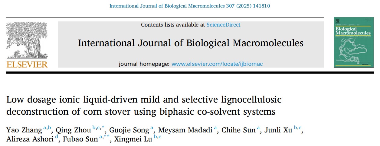 生物资源与生物炼制研究团队在质子型离子液体高效拆解木质纤维素生物质方面取得重要进展,研究成果“Low dosage ionic liquid-driven mild and selective lignocellulosic deconstruction of corn stover using biphasic co-solvent systems”正式发表于International Journal of Biological Macromolecules(一区, Top, IF 7.7)。
