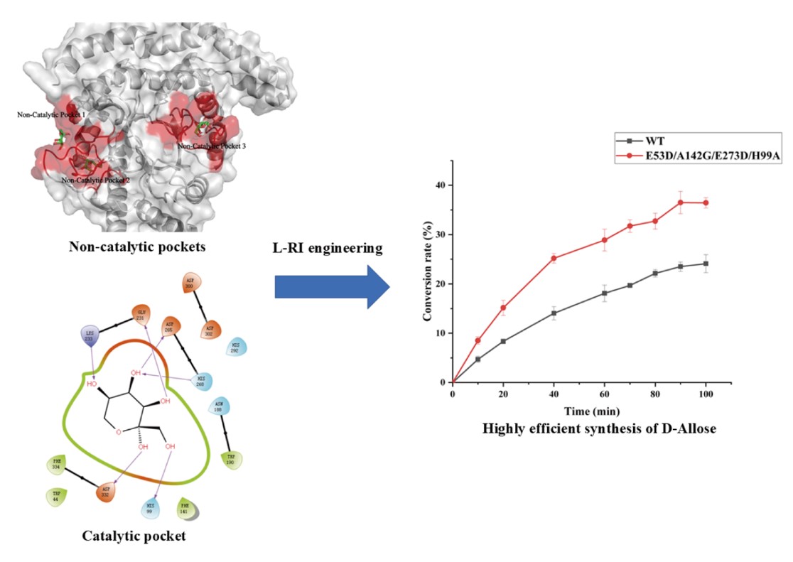 D-阿洛糖是一种在食品、制药和医疗保健等行业具有重要应用价值的稀有糖。最常见的生产D-阿洛糖的方法是由L-鼠李糖异构酶(L-RI)催化D-阿洛酮糖转化合成。然而,该酶催化合成D-阿洛糖的效率相对较低。基于此,本研究以一种来源于Clostridium stercorarium的L-RI为研究对象,通过对其非催化口袋和催化口袋中的关键氨基酸进行突变,得到了催化效率远高于野生型的组合突变体,最后将其在枯草芽孢杆菌中进行了重组表达,测试了其合成 D-阿洛糖的性能,为工业生产D-阿洛糖提供了一种有潜力的高效生物催化剂。