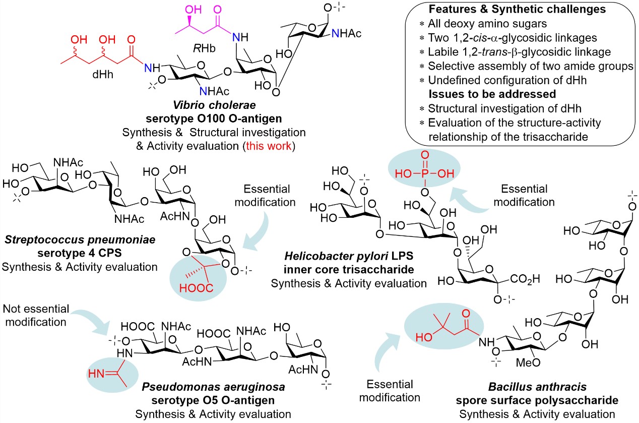 关键抗原表位的鉴定是新型糖缀合物疫苗研发的核心环节。细菌表面聚糖(BSG)的抗原表位取决于聚糖链长度、序列、末端结构以及修饰基团等要素。研究证实,BSG的酰胺、丙酮酸和磷酸等修饰是决定其抗原性的关键因素(图1)。然而,BSG中各类修饰基团的免疫学功能尚未得到充分阐明。霍乱弧菌O100血清型O-抗原三糖含有RHb和dHh修饰,其免疫学特性亟需深入研究。此外,该抗原中dHh的构型也尚未明确。因此,化学合成霍乱弧菌O100血清型O-抗原三糖成为解决上述问题的关键。