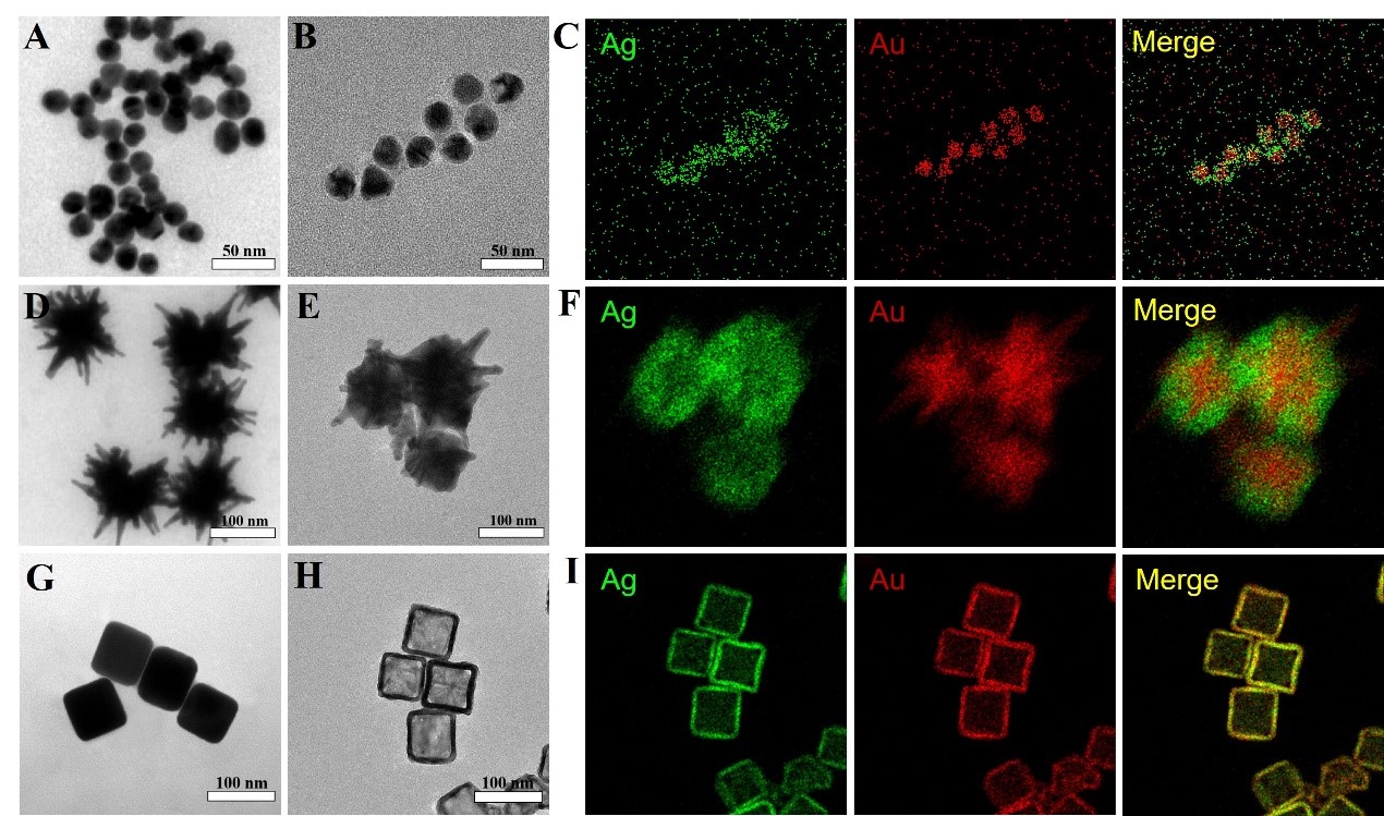 图2 三种金银复合SERS基底的形貌表征与元素分析