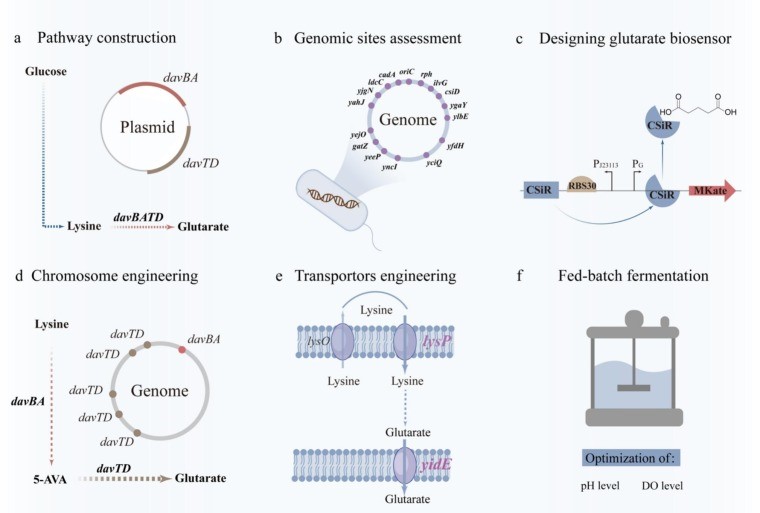 戊二酸是一种重要的C5二元酸,可作为聚酯和聚酰胺合成的关键前体。传统的化学法以丁内酯和氰化钾为原料,存在能源消耗高、污染严重等问题,因此开发可持续的生物制造路径成为研究热点。当前微生物合成戊二酸主要依赖于质粒表达系统,但其在发酵过程中存在代谢负担重、遗传不稳定、对抗生素依赖性强等问题,难以满足工业化需求。因此,构建无质粒表达的稳定工程菌株成为提升平台产物可规模化生产的关键。为了实现这一目标,本研究开发出一种无质粒表达、无需抗生素和诱导剂的工程菌株,实现了从葡萄糖出发的高效戊二酸生产。