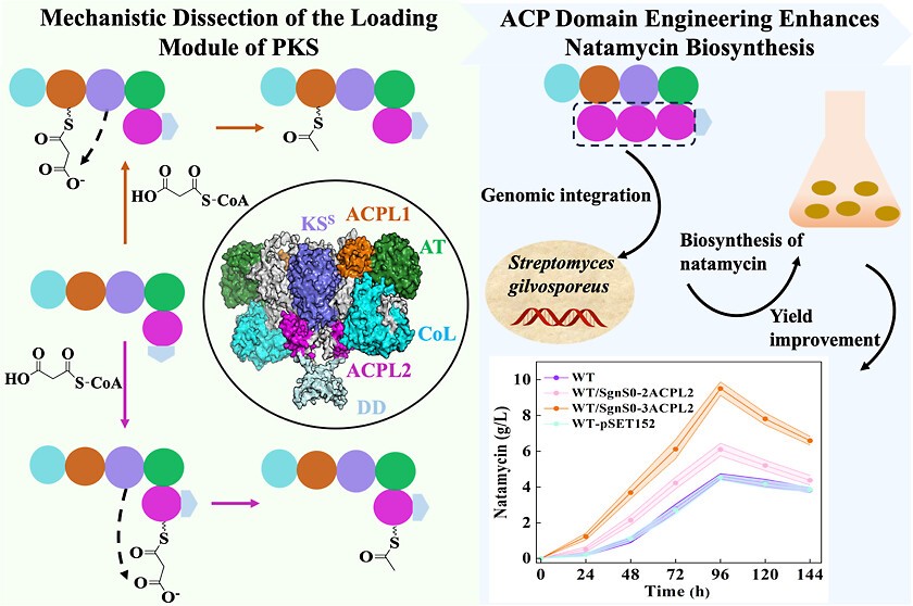 张荣珍团队解析了SgnS0起始模块的催化机理,并基于结构特征设计重组菌大幅度提高了纳他霉素的产量。纳他霉素的生物合成机理研究显示,sgnS0基因是其生物合成途径中的关键必需基因。通过对SgnS0的KSS和AT结构域定点突变,发现AT结构域特异性将丙二酰基装载至ACP结构域,随后经KSS介导的脱羧反应生成乙酰-ACP中间体。CoL结构域的缺失会显著降低催化效率,表明CoL虽非催化活性所必需,但作为结构调节器可优化酶的催化性能。进一步突变与体外酶学分析表明,ACPL1和ACPL2均对纳他霉素合成至关重要,双失活突变完全抑制纳他霉素合成。基于上述发现,我们在S. gilvosporeus F607中对SgnS0模块进行了串联ACP结构工程改造,发现 ACP多拷贝重组菌能显著提高转酰效率,kcat/Km值增加2.64倍,纳他霉素产量达到9.5 g·L–1,比野生型提高了1.6倍。这些结果不仅揭示了模块化PKS中ACP结构域的功能机制,也为ACP串联工程提高次级代谢产物产量提供了有效策略。