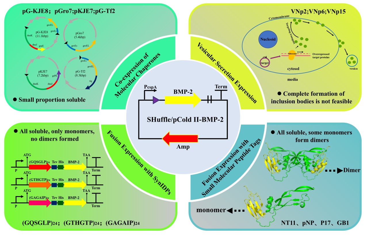 罗伟团队通过系统优化表达策略,采用pCold II冷激表达载体与SHuffle T7宿主菌株,并引入GB1小分子肽标签,成功实现了rhBMP-2的完全可溶性表达。