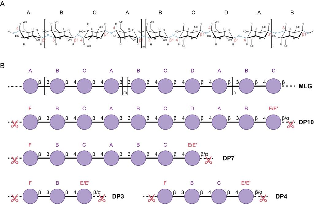 混合连接β-葡聚糖(Mixed-linked β-glucan, MLG)是广泛存在于燕麦、大麦等谷物中的一类重要膳食多糖,因其独特的分子结构而具有调节血糖、增强免疫及益生元等多种生物活性,MLG的降解产物也被证明具有多种生物活性。然而,传统酶解方法通常专一性不强,产生的寡糖产物结构不均一,限制了其在功能性食品和生物医药领域的高值化开发和应用。基于此,本研究首次从高等真菌虎奶菇(Pleurotus tuber-regium)基因组中挖掘出一种新型的β-1,4-葡聚糖酶(命名为PTRBGL4),并成功在毕赤酵母中实现异源表达。研究发现,该酶对仅含β-1,4-糖苷键的底物(如羧甲基纤维素钠)活性较低,但对含有β-1,3和β-1,4混合连接的燕麦及大麦β-葡聚糖表现出极高的催化活性和特异性。