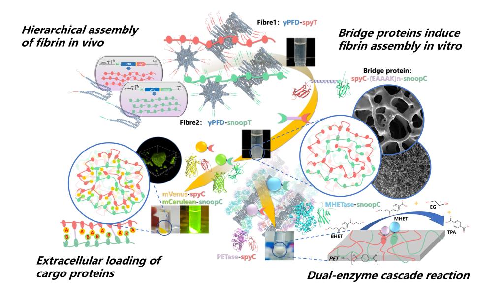 通过支架介导的多酶复合体空间有序组装对于提升催化性能至关重要。然而,构建兼具可编程性与可重复利用性的支架体系仍面临重大挑战。现有方法通常只能实现酶分子的随机分布,而难以实现精确的空间定位,从而限制了级联催化的整体效率;同时,多数级联催化体系仅形成可溶性复合物或依赖外部载体,缺乏宏观可操作性,从而限制了体系在实际工业应用中的可行性。针对此问题,本研究构建了一种完全由蛋白质组成且具遗传可编程性的支架体系,通过将双正交识别模块SpyTag/SnoopTag分别与超稳定的自组装γ-Prefoldin(γPFD)纤维融合,实现正交化修饰。进一步的,结合由SpyCatcher/SnoopCatcher和含刚性螺旋片段A(EAAAK)nA构建的SpyC-A(EAAAK)nA-SnoopC 桥接蛋白,实现了宏观、可控的组装结构。该组装体系可形成易于分离与重复使用的宏观材料。通过交替排列携带SpyTag和SnoopTag的γPFD纤维,并调控桥接蛋白的长度,可实现货物蛋白的几何精确共固定化及可调控的空间组织。利用荧光共振能量转移(FRET)分析验证了蛋白定位的精确性。作为验证性应用,本支架体系显著提高了PETase与MHETase的热半衰期,分别提升约25倍与15倍。在聚对苯二甲酸乙二醇酯(PET)降解反应中,由于优化的酶间距离与潜在的底物通道效应,共固定化酶系的对苯二甲酸产率较游离酶提升约3.2倍。此外,该生物催化剂经10次循环使用后仍保持约75%的初始活性,显示出优异的可重复利用性。该研究提出了一种可编程蛋白质支架的通用设计策略,可在同时提升酶的稳定性、活性与循环使用性能的基础上,促进可持续生物制造领域的发展。