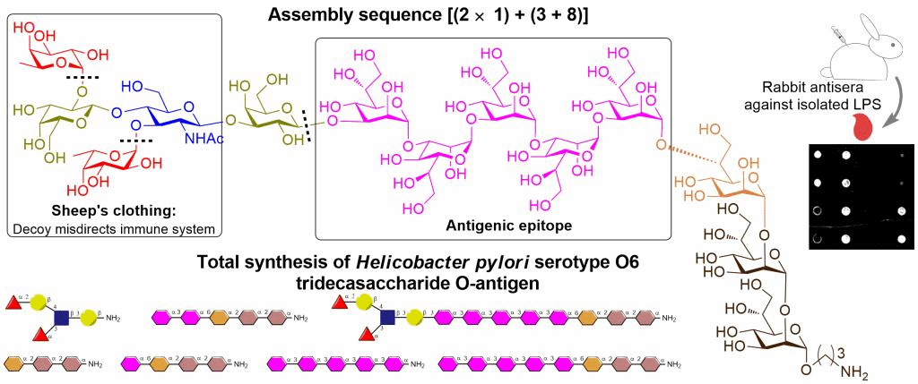 幽门螺旋杆菌全球感染率高达50%,与慢性胃炎、消化性溃疡和胃癌的发病密切相关。尽管针对幽门螺旋杆菌感染的抗生素疗法有一定效果,但是细菌耐药性和重复感染已导致治疗失败率高达20%,而全球目前尚无上市的幽门螺旋杆菌疫苗,因此疫苗的开发迫在眉睫。幽门螺旋杆菌O6血清型O-抗原十三糖由末端Ley四糖和独特的DD-庚聚八糖通过β-D-半乳糖连接而成,是糖缀合物疫苗开发中极具潜力的免疫靶点。鉴于Ley四糖广泛存在于人体细胞表面,其在幽门螺旋杆菌侵入、感染、免疫逃逸中所起作用一直存在争议,使得此类O-抗原在疫苗开发中的应用存在挑战。