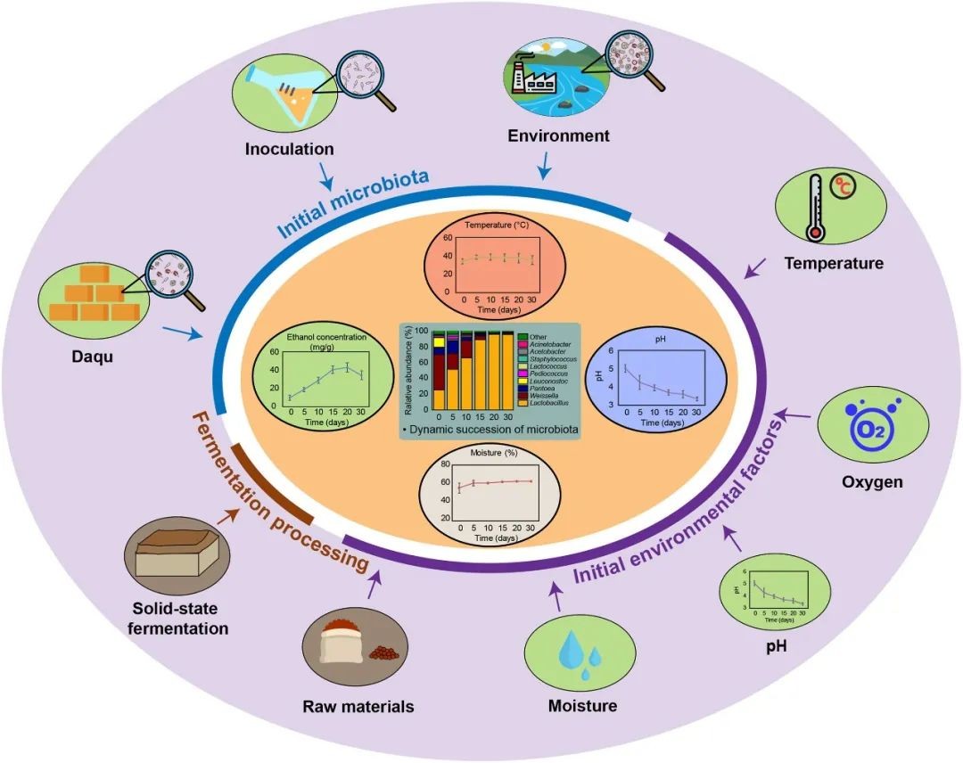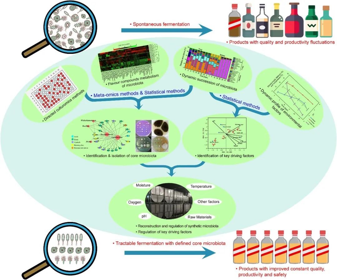 在自然食品发酵中,复杂微生物菌群的代谢活动会产生食品所需的风味,这是决定消费者对食品喜好的关键标准。因此,微生物代谢形成的风味化合物可以作为食品自然发酵改造控制的目标。然而,关于与风味化合物形成相关的复杂微生物菌群的了解相对较少。因此,文章以中国白酒为例,系统介绍了基于微生物菌群对发酵食品风味控制的关键生物技术,包括微生物菌群演替的驱动,风味化合物形成以及风味化合物的代谢调控。