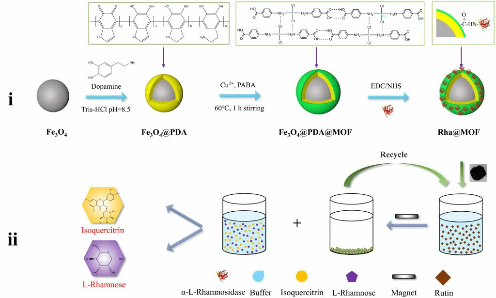 郑璞教授团队在MOF固定化酶方面取得进展,研究成果“Immobilization of alpha-L-rhamnosidase on a magnetic metal-organic framework to effectively improve its reusability in the hydrolysis of rutin”正式发表于Bioresource Technology (IF = 7.539) (//doi.org/10.1016/j.biortech.2020.124611)。