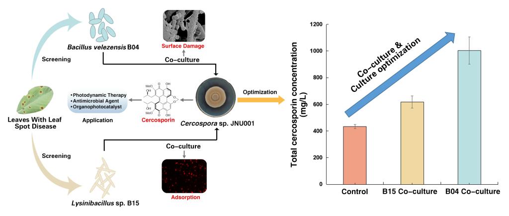 饶义剑教授团队从一瓶偶然染菌却导致尾孢菌素高产的发酵实验过程中获得灵感,为此希望人工理性构建“细菌-尾孢菌”共培养体系以提高尾孢菌素产量。考虑到尾孢菌是一种植物叶斑病致病菌,为此从患有叶斑病的植物叶片中分离筛选内生细菌作为共培养菌株来源,通过模仿其在自然界中的生长压力以提高尾孢菌素产量。的确,经过筛选获得的内生细菌Bacillus velezensis B04和Lysinibacillus sp. B15使尾孢菌素产量在传统优化基础上分别提升至984.4 mg/L和626.3 mg/L,是起始条件的7.7和4.9倍。更重要的是,在共培养机理解析方面,提出了新颖的“损伤”和“吸附”提高产量的共培养机理,为共培养机理理论研究和后续更便捷提产方法的探索提供了新的思路。