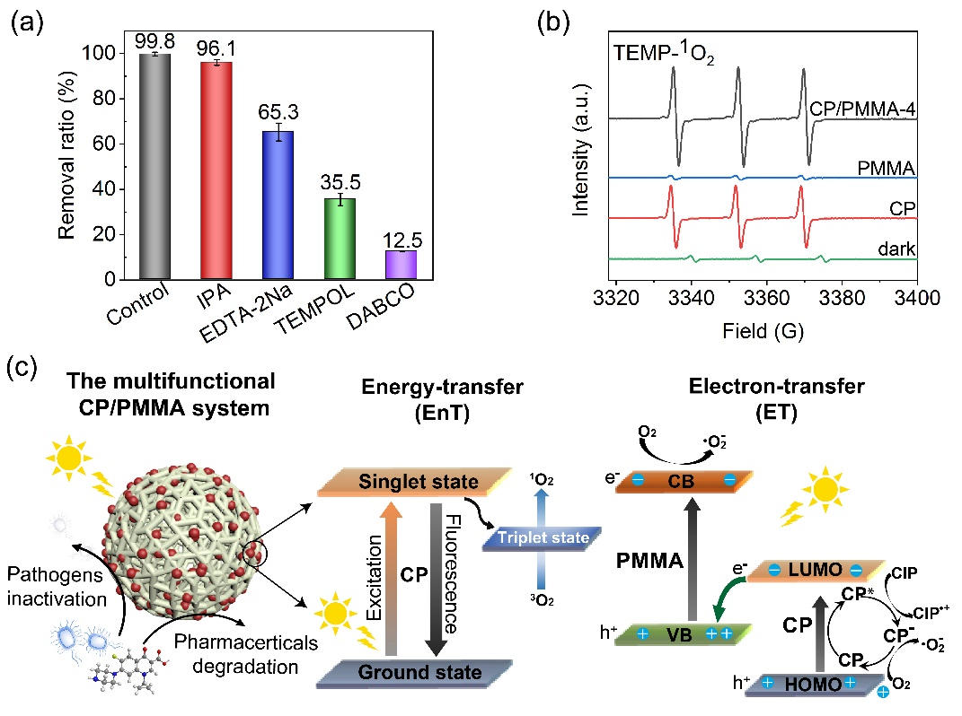 饶义剑教授团队利用前期开发的真菌来源的苝醌类天然产物尾孢菌素特有的优异光敏性(Zhou,et al,2021,Microbial Cell Factories;Li, et al, 2019,Green Chemistry;Tang, et al, 2019,J Catalysis;Li, et al, 2021,J Catalysis),仿生将尾孢菌素与大孔吸附树脂进行结合,形成一种新型的光催化剂(CP/PMMA),它可以无选择性地利用太阳光高效快速光降解水体中残留的不同类型药物分子,包括加替沙星,莫西沙星,氧氟沙星,恩诺沙星,司帕沙星,环丙沙星,磷酸氯喹,甲氧苄啶等。此外,CP/PMMA也表现出优异的抑制和降解致病菌金黄色葡萄球菌(Staphylococcus aureus)生长的活性。更重要的是,这种新型光催化剂CP/PMMA经过多次重复使用后依然能够保持着良好的稳定性与催化活力,这为环境水污染治理和修复提供了新技术。