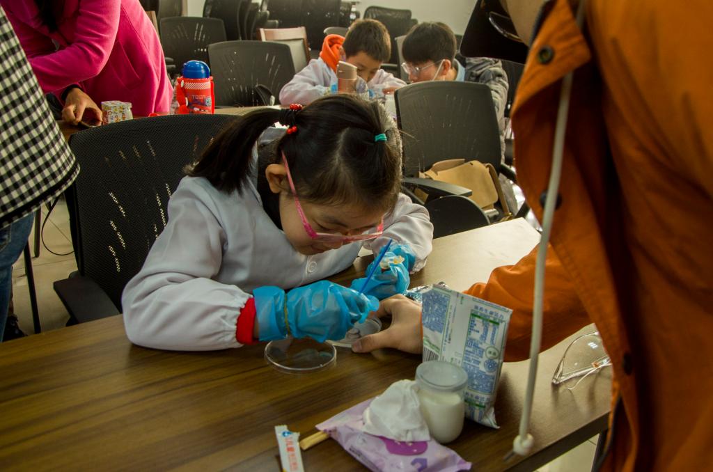 随后,在支部党员的指导下,小朋友们进行了显微镜观察微生物、酸奶制作、淀粉平板绘图等三项趣味小实验。对于细菌和真菌两种不同类型的微生物,小朋友们根据自己观察到的特点,分别进行了形态、颜色、数量等多方位的描述。在支部党员专业的讲解下,小朋友们进一步加深了对这两种类型微生物的认识。拿着小巧可爱的酸奶瓶,小朋友们将菌粉倒入装有纯牛奶的瓶中,直呼“我也会做酸奶啦!”在淀粉平板上,小朋友们奇思妙想,蘸取碘液绘制了花朵、太阳、甲虫、草地等生动的图形。小朋友在自己动手绘画的同时,更是感受到了生化反应的神奇。整个实验过程中,家长们也积极参与进来,与小朋友们配合共同完成实验。