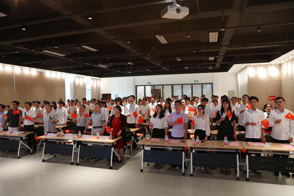 仪式在庄严的《国际歌》中拉开帷幕,周云龙宣读新发展预备党员名单并与关工委老师们为2021年新党员代表佩戴党员徽章。由吴骥一领誓,160位预备党员举起右拳,慷慨激昂,在党旗下光荣宣誓。随后,来自酿酒1901班新发展的预备党员郎绪涛代表全体学生党员发言,同时向党组织承诺:严格以党员的标准要求自己,鞭策自己,一颗红心跟党走,逐梦青春正当时!活动当日是七七事变爆发84周年。84年前,无数中华儿女不顾生死,为保卫河山浴血奋战。在场师生有感而发,全体默哀,致敬先辈不屈的抗争。随后,来自酿酒1802班的张欣怡、基地1801班的杨若青和发酵1902班的马俊,结合学院开展的“千里行——党史学习宣讲团”、“百名学生党员走访百名老党员”等活动,声情并茂,充满自豪地分享了自己与党的故事。在高涨的热情中,周云龙和张星元以嘹亮的歌声带领全场党员们唱响《没有共产党就没有新中国》,歌声在会场久久回荡,现场气氛十分热烈。最后,诸葛健开展了题为“不忘初心 坚持信仰 立足本职”主题微党课,给同学们讲述了他的入党初心和使命担当,在场青年党员深有感触,进一步认识到加入党组织是一种政治选择,也是一种精神追求和人生价值的承诺,最后他寄语新党员:国家的希望寄托在你们身上!努力吧,年轻人!