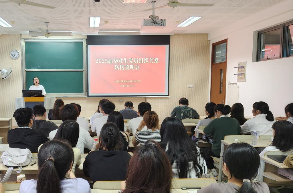 严格落实:开展一次转接说明。毕业生党员离校在即,严肃、及时、妥善办理组织关系转接手续是党的纪律要求。各毕业班党支部召开专门的党员组织关系转接说明会,详细说明组织关系转接和档案移交的注意事项,进一步强化党员的身份意识和责任意识。