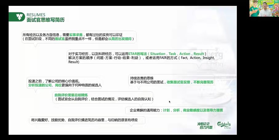 第九届“职场问道”系列讲座第四期“外企管培面试官教你用面试官的思维写简历”以腾讯会议加直播的形式在线上顺利举办。来自全球第三大啤酒公司嘉士伯集团的嘉士伯中国人力资源经理聂俊杰、嘉士伯中国招聘专员王诗言受邀做主题分享。嘉士伯中国人力资源经理李芳菊、学院党委副书记周云龙、分管学生就业工作辅导员陆燊佳,以及500余名学生参加活动。