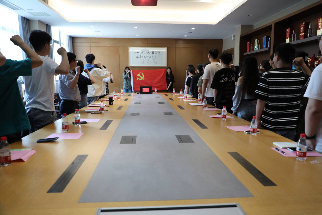 同时,毕业生党员在各自支部书记的带领下,面向鲜红党旗,共同重温入党誓词。党员们声音洪亮、激情澎湃,在铮铮誓言中重温入党初心,坚定信心奔赴充满光荣与梦想的远征。