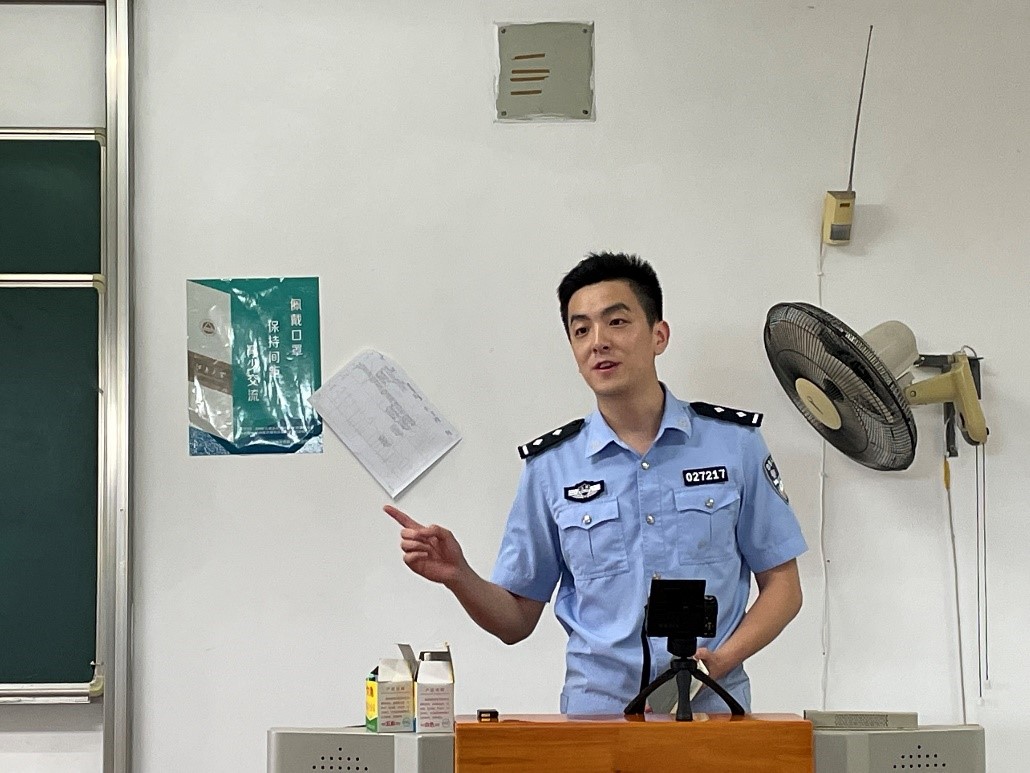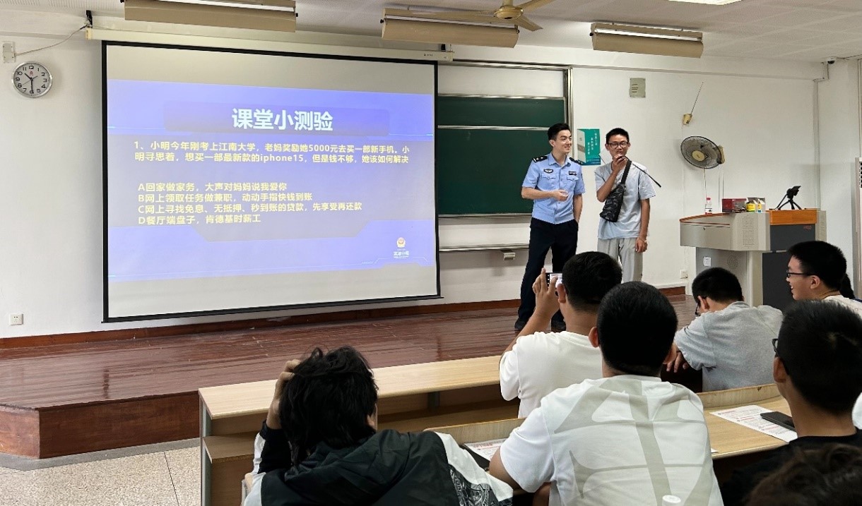 首先,王俊皓警官为2023级本科新生带来《防范诈骗专题讲座之走进高校》主题报告。王警官以什么是电信网络诈骗、大学生常见诈骗类型、骗局常用的心理学、诈骗防范等为热点话题,通过数据剖析、图文展示、案例分析等方式系统全面地讲解了网络诈骗常见手段与防范措施。同时提醒全体同学们务必遵守法制、谨慎网络发言,教育同学们做健康网民。在互动环节,王警官带领全体同学宣读“全民反诈,无欺无诈”口号,并以课堂小测验方式检验同学学习成果,并号召同学下载国家反诈中心App,构筑校园平安金钟罩。