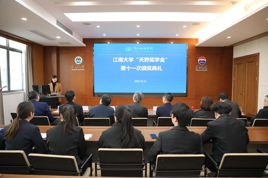 程捷音宣读获奖名单。赵英汉、张长太、李洋等19名同学分获本次“天野奖学金”一、二、三等奖,细胞培养肉团队获评团队奖。颁奖仪式上,陈坚、小林俊一、刘龙分别为一、二、三等奖获得者颁奖,天野源之为团队奖颁奖。学院2021级硕士赵英汉作为获奖学生代表发言。他回顾了自己在食品合成生物学与生物制造团队的学习科研经历,并对天野酶制品株式会社的资助和快看漫画