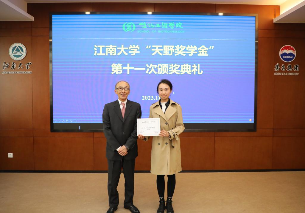 陈坚在致辞中对天野酶制品株式会社和天野源之先生长期以来对学校学院各项事业的支持表示感谢。他回顾了自己和天野先生结识、开展合作的历程,并追思了张启先校友,及其与学校、天野公司的渊源。最后,他勉励获奖同学“立大志,干大事”,要努力学习,刻苦钻研,使自己成为栋梁之才,从而为中日友好、社会发展和人类文明进步作出贡献。