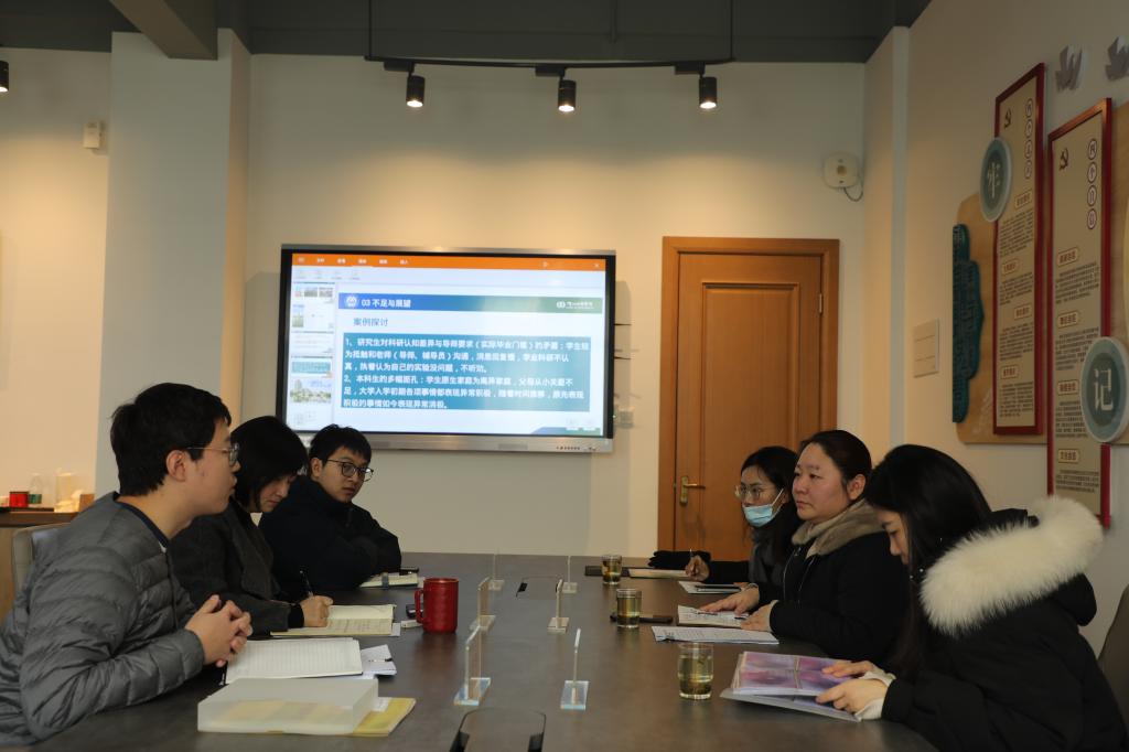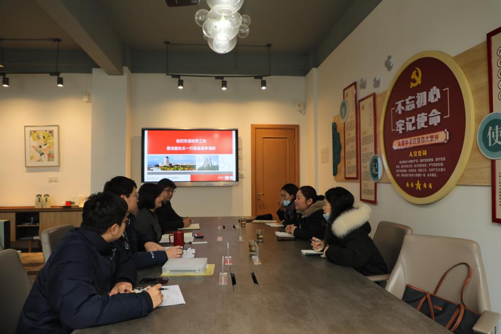 林丹代表学院对蒋洁一行的到来表示热烈欢迎,向学工处各位领导以及心理中心各位老师对学院心理工作的关心和指导表示感谢。会上,围绕学院心理健康工作站的组织架构、心育队伍建设、品牌活动及特色做法等进行了工作汇报和交流,并重点分析了现阶段学院心理工作面临的困难与挑战,指出下一步将继续深挖院内外资源,着力激发心理工作队伍内驱力,并将“心育”有机融入到“五育”过程,丰盈“幸福下午茶”品牌活动内涵,进一步提升品牌影响力,不断优化提升学院心理健康教育工作格局体系。